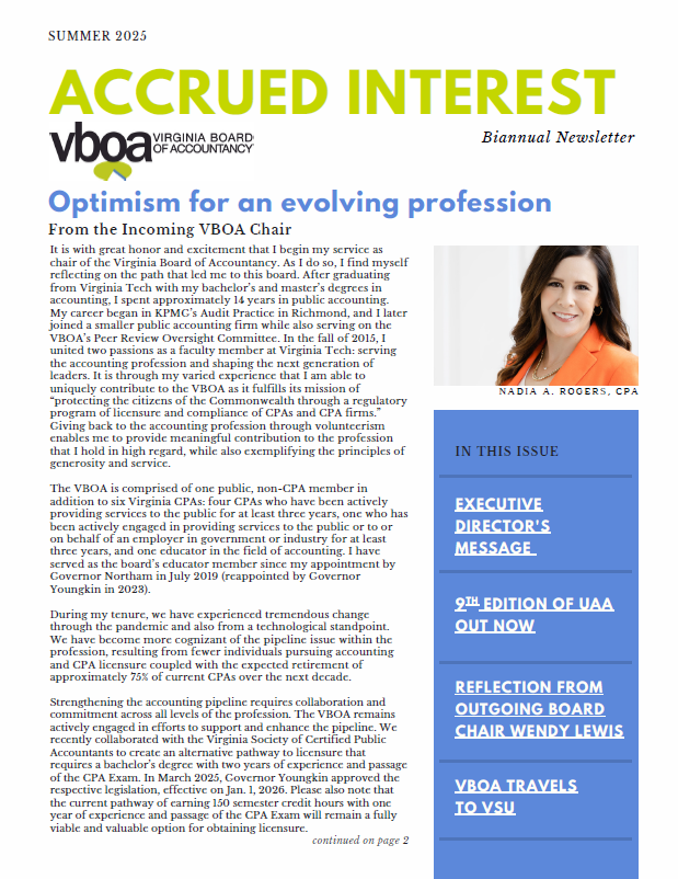تصدر هيئة المحاسبين القانونيين في فيرجينيا نشرة إخبارية مرتين في السنة مليئة بالأخبار والتحديثات ذات الصلة بمجتمع المحاسبين القانونيين في فيرجينيا ومجتمع المرشحين للامتحانات، بالإضافة إلى الإجراءات التأديبية.